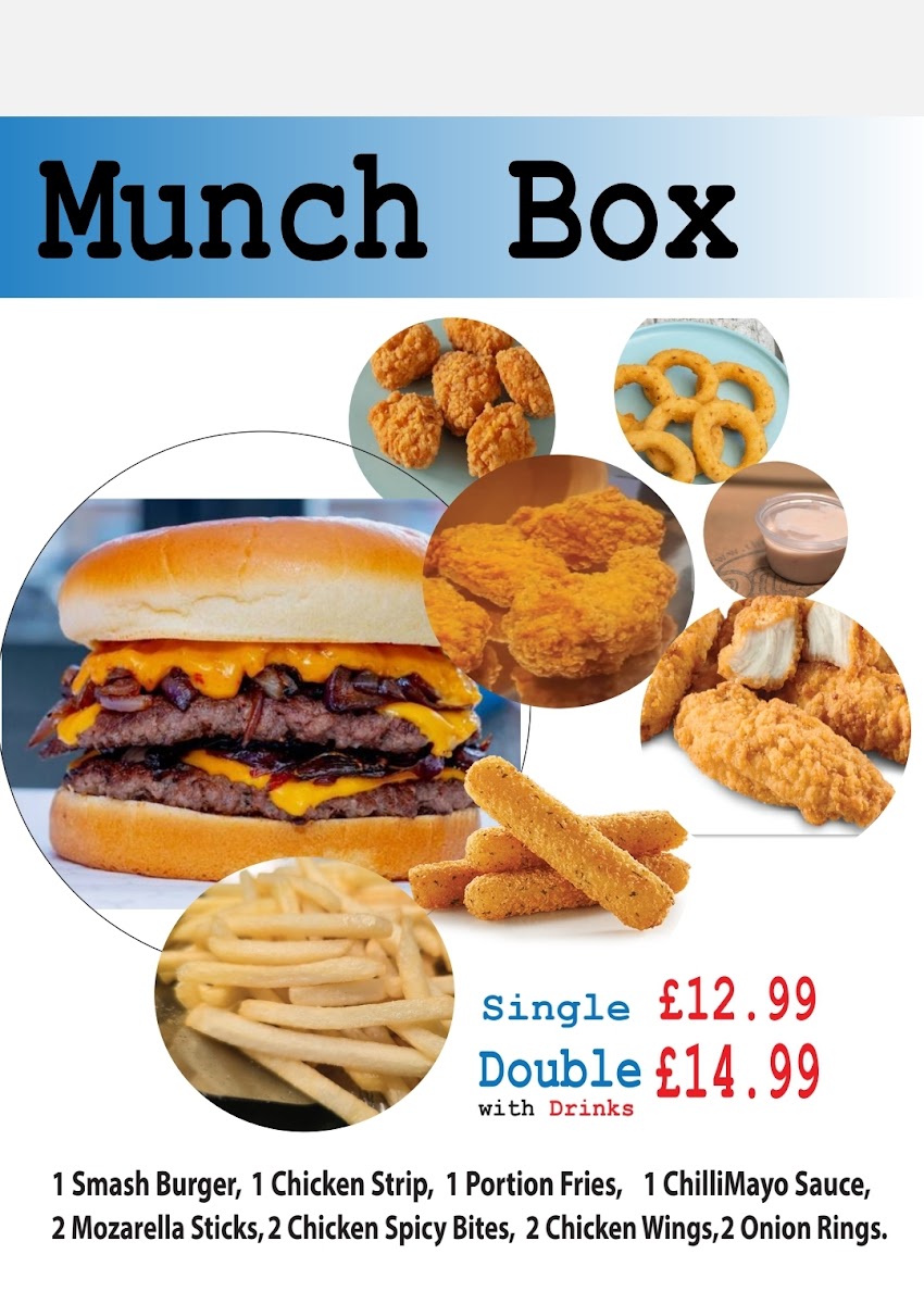 Signature Smash, Smash Hopper, Hot Wings, Cheese Chilli Nuggets, Mac and cheese, Dips ,Fries and Drinks